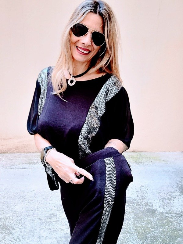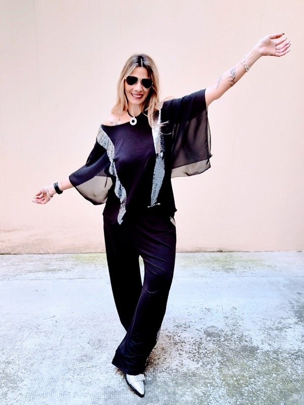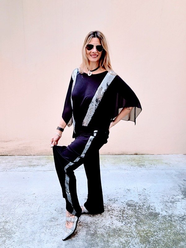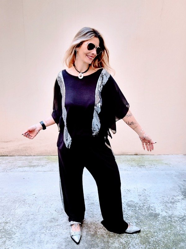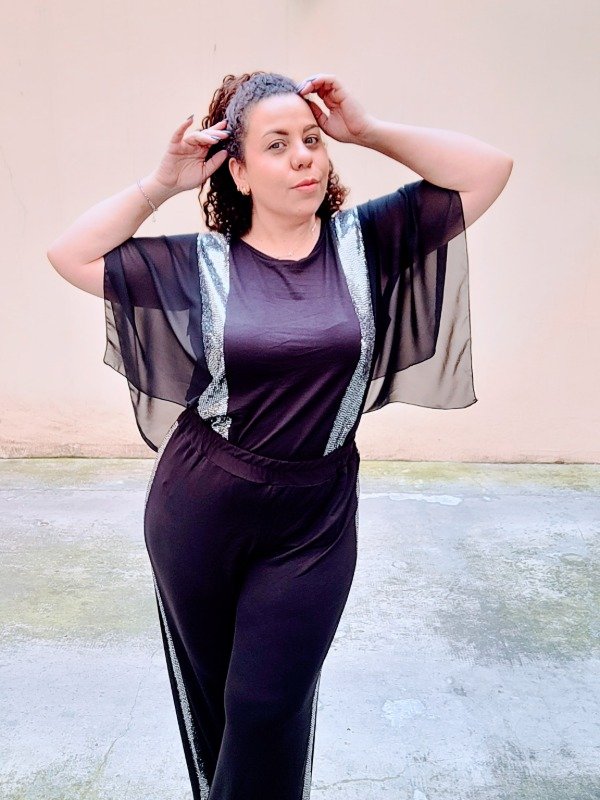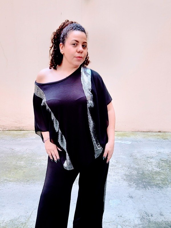 👉Descripción: 👀Palazzo de crep viscosa combinado con tira brillo plateado que se adapta a talle 52 y Remerón haciendo juego con mangas de gasa que equivale a 48/50 (110 de busto) 👀