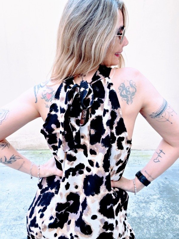 La muscu tiene cuello americano que se ajusta detrás del cuello y corte evasé sueltito. Cede hasta 120 de busto.