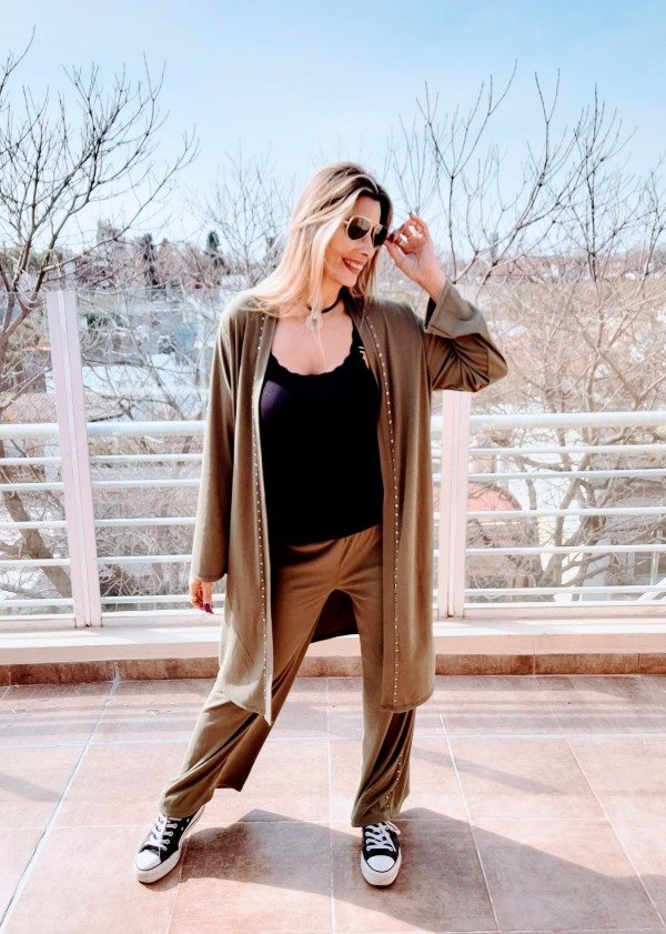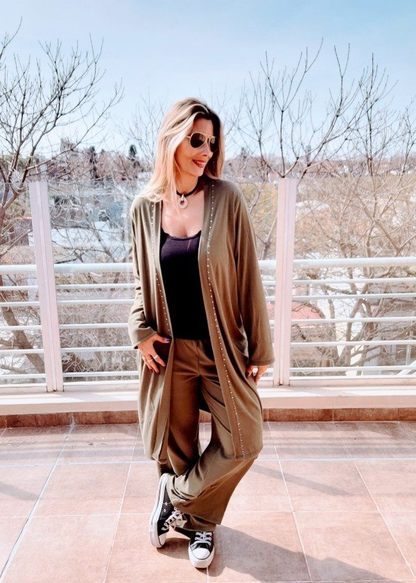 Incluye palazzo talle 4 (40/42), 6 (44/46) y 8 (48/50) y saco Capita oversize (free size adaptable hasta XXL) en morley, ambos con detalles de tachas que le dan un toque canchero y sofisticado.