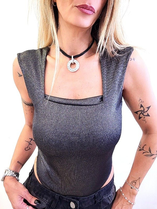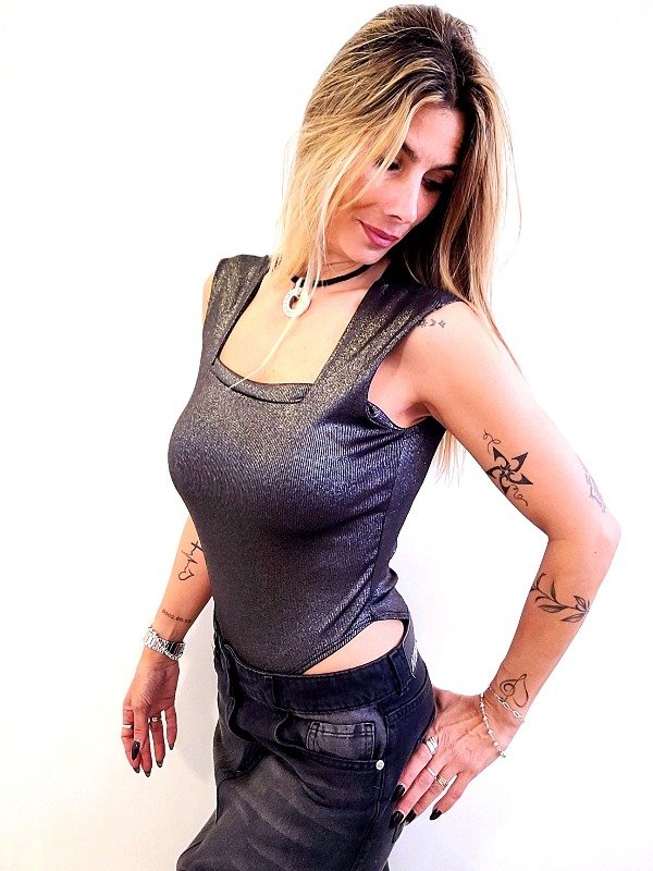 Body Rib foil metalizado, escote cuadrado, breteles anchos.
