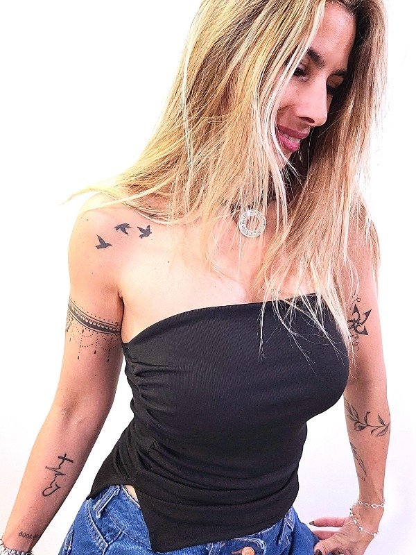 Top strapless de ribb doble en la parte del busto, con frunce lateral y aberturas.