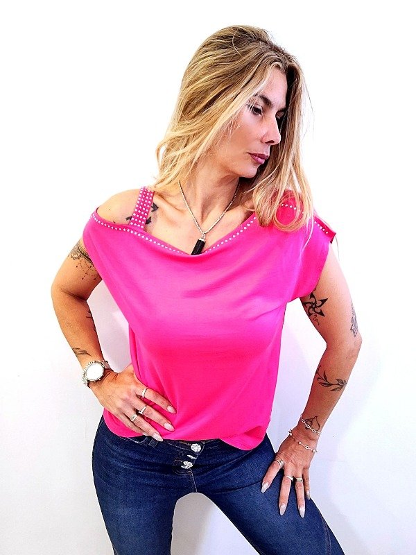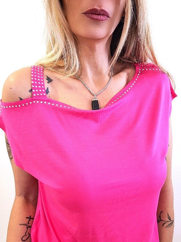 Remera de modal con un solo hombro bretel ancho, con tachas en bretel y escote.