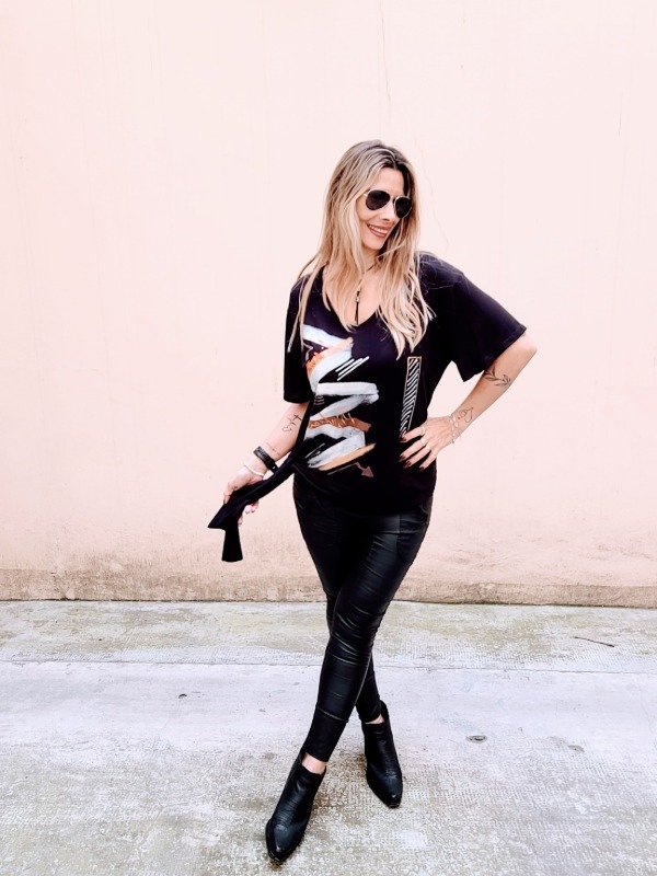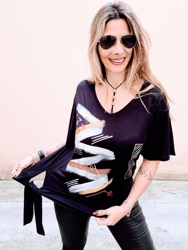 👉Descripción: 📷Remera de modal viscosa, escote en V amplio, con lazos que se anudan de costado según la medida que te guste. Estampado artesanal en foil metalizados 📷