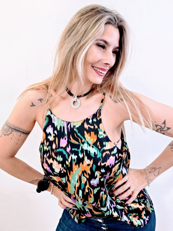 👉Descripción: 🔆Musculosa de saten corte evasé que puede usarse de ambos lados. El primero escote en V y el segundo más cerrado.