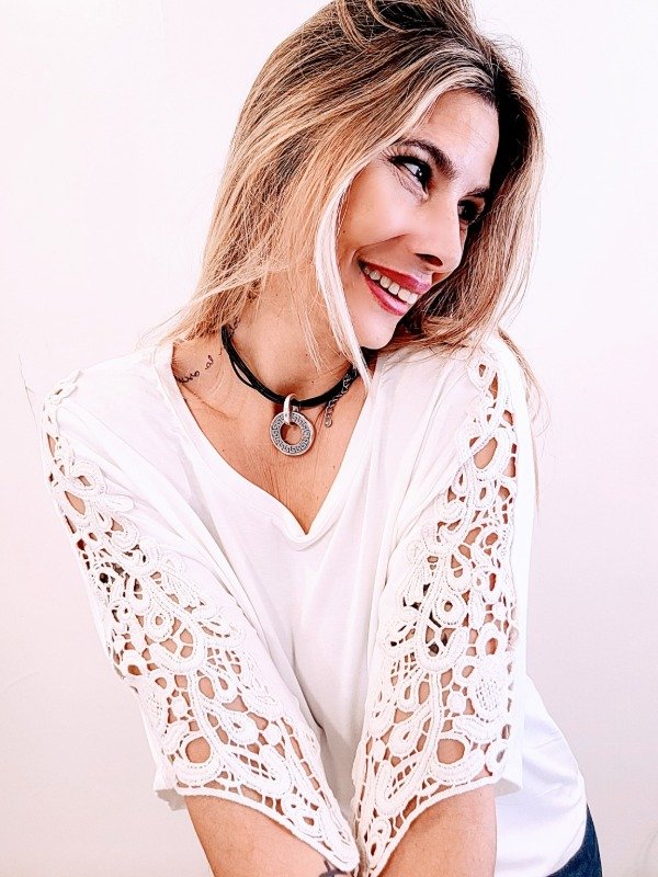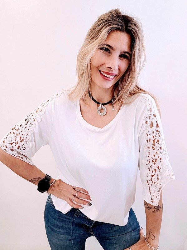 👉Descripción: 💋Remera de modal con mangasv3/4 de crochet.💋