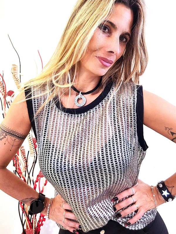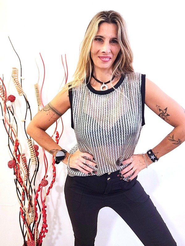 Musculosa red foil plata con vivos negros.
