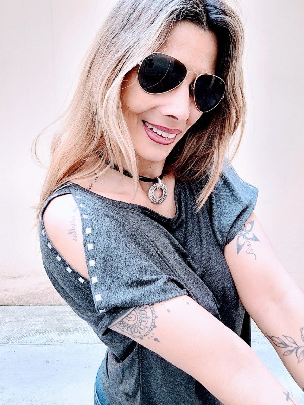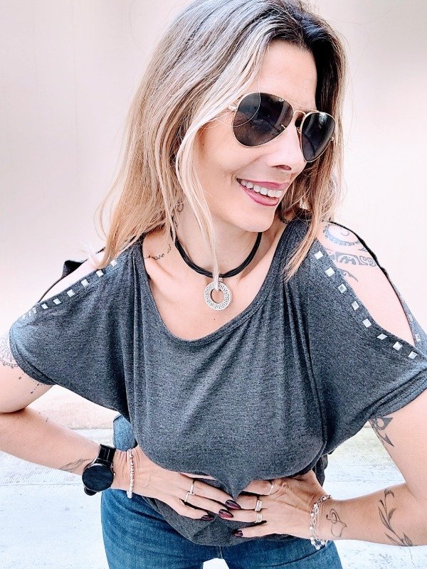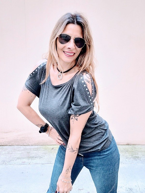 👉Descripción: 💚 Remera de modal viscosa, con hombros descubiertos e hilera de tachas.