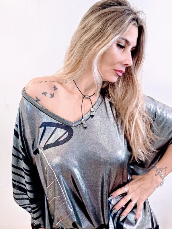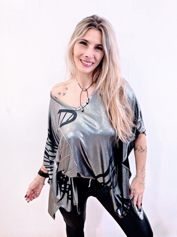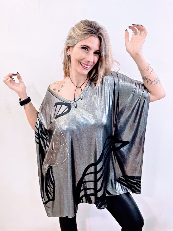 👉Descripción: 💕Ponchito de lurex, escote en V sublimado artesanalmente con detalles en foil.