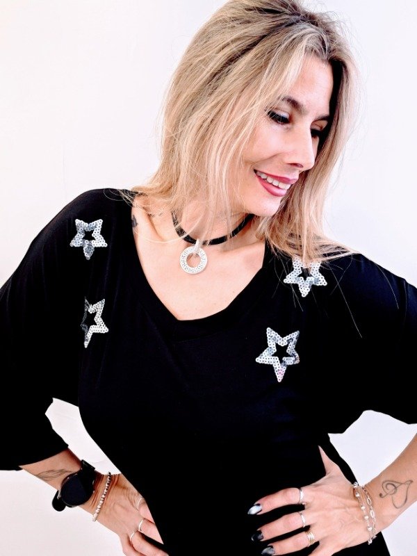 ✴️Maxi Remeron de modal viscosa escote en V, con aplique bordado de estrellas de lentejuelas