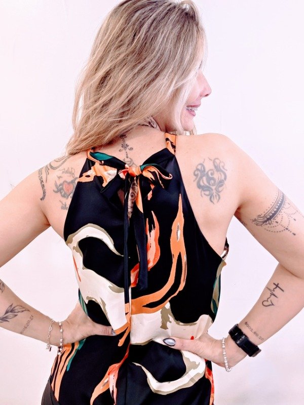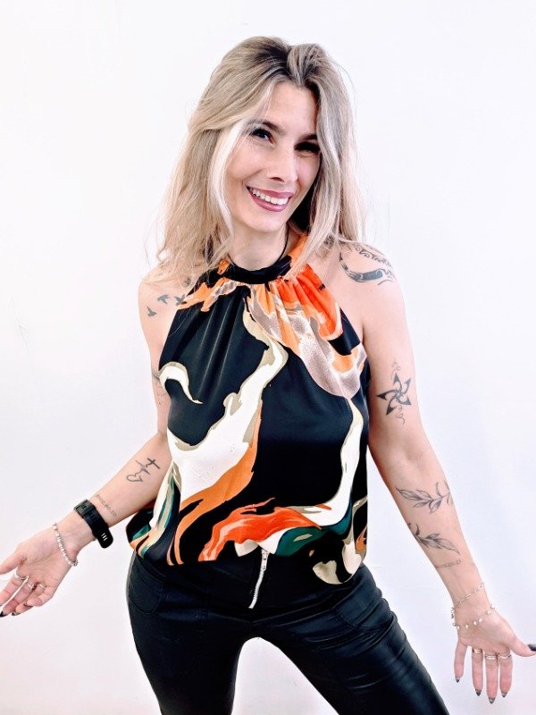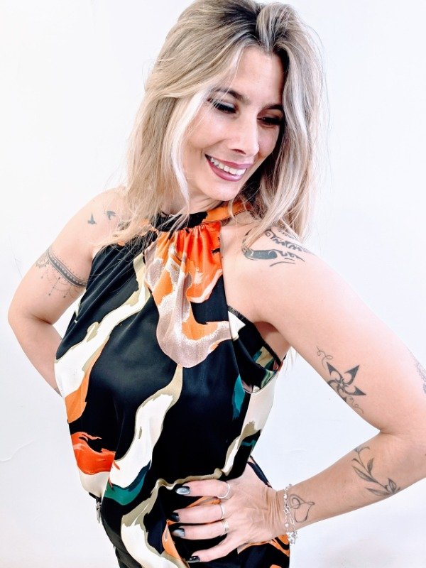 👉Descripción: 🔆Musculosa de saten corte evasé con cuello americano fruncido, que se anuda atrás del cuello.