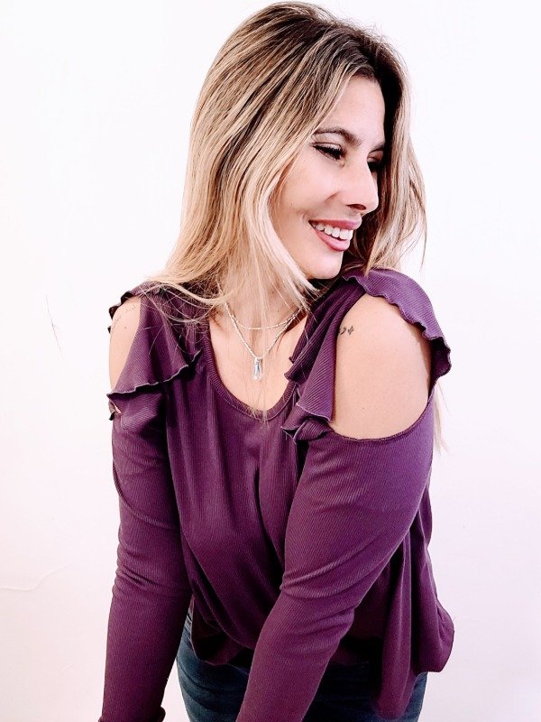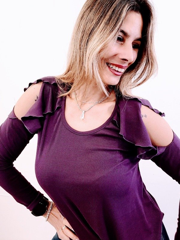 👉Descripción: Remera de morley soft con hombros descubiertos y volados.