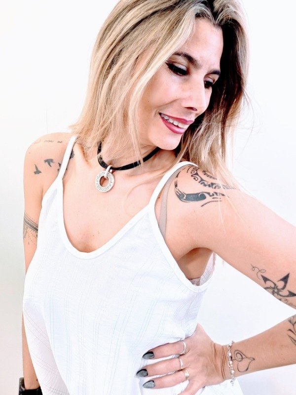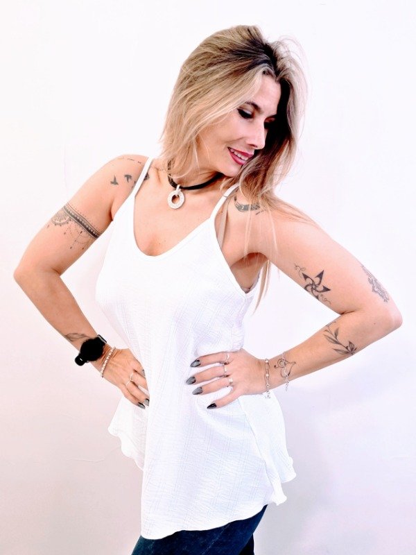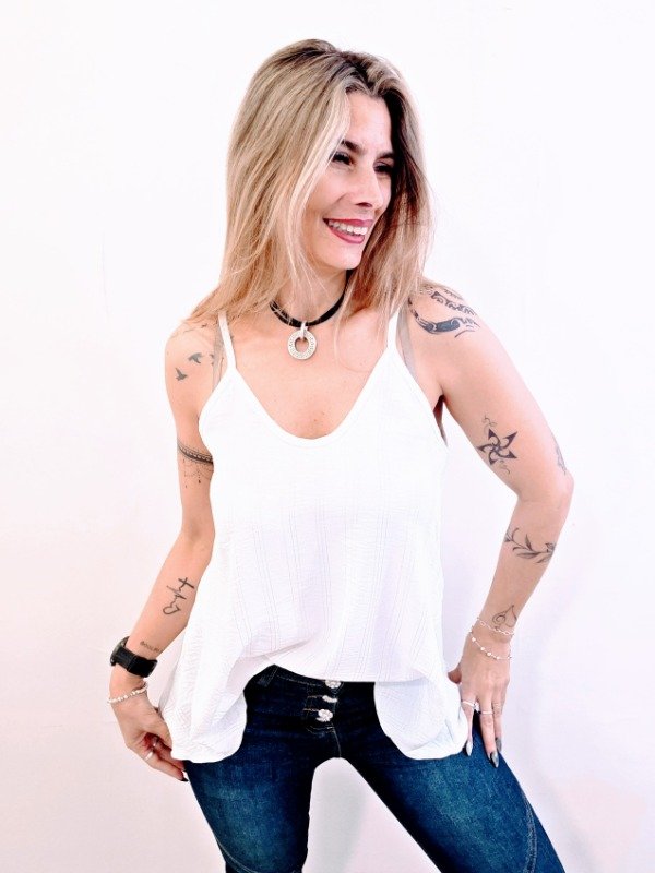 👉Descripción: ✴️Musculosa de cey con líneas en lurex plateado, corte evasé amplia y larguita.