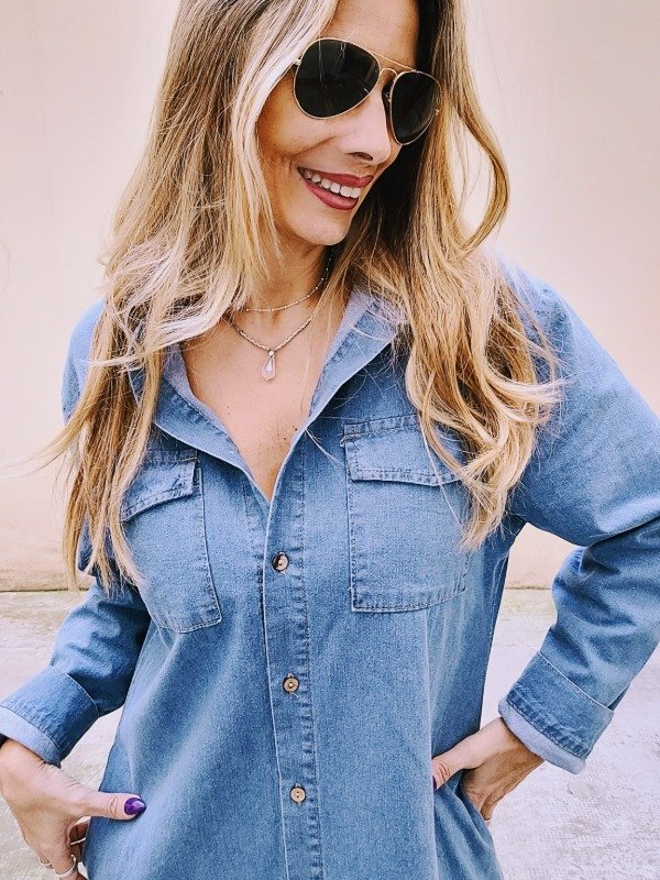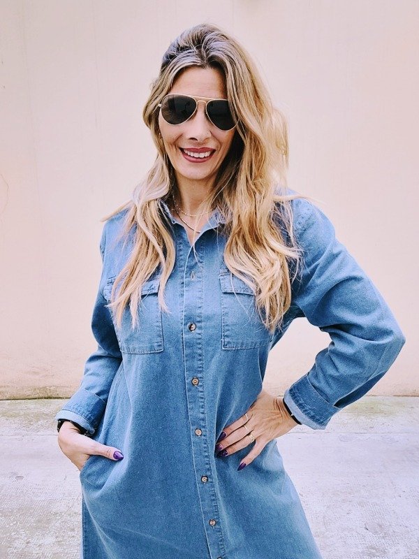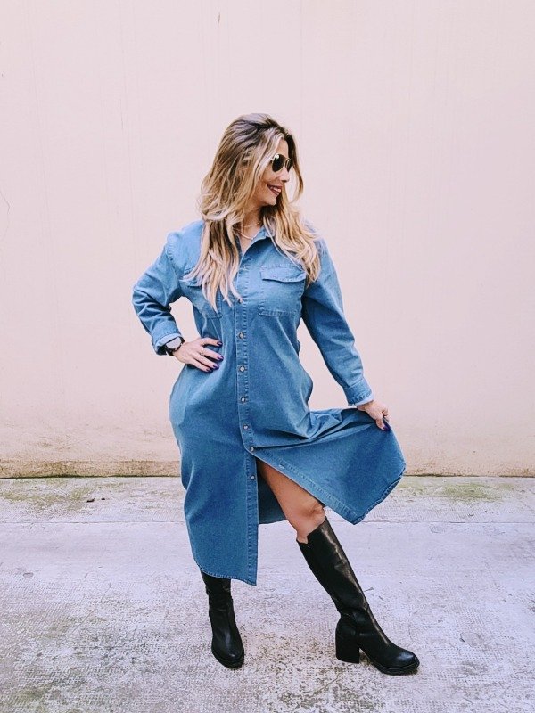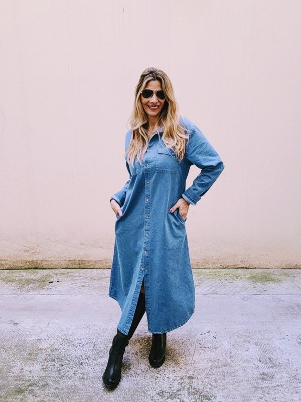 Vestido camisero en denim liviano con bolsillos.