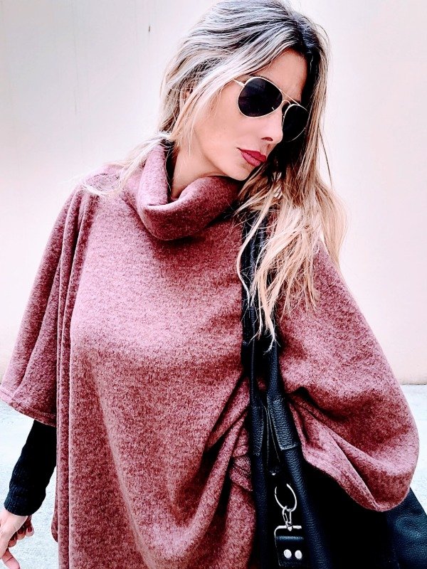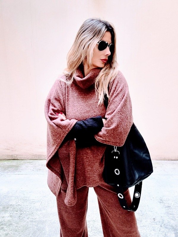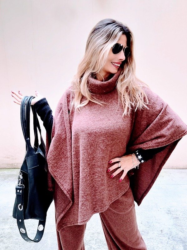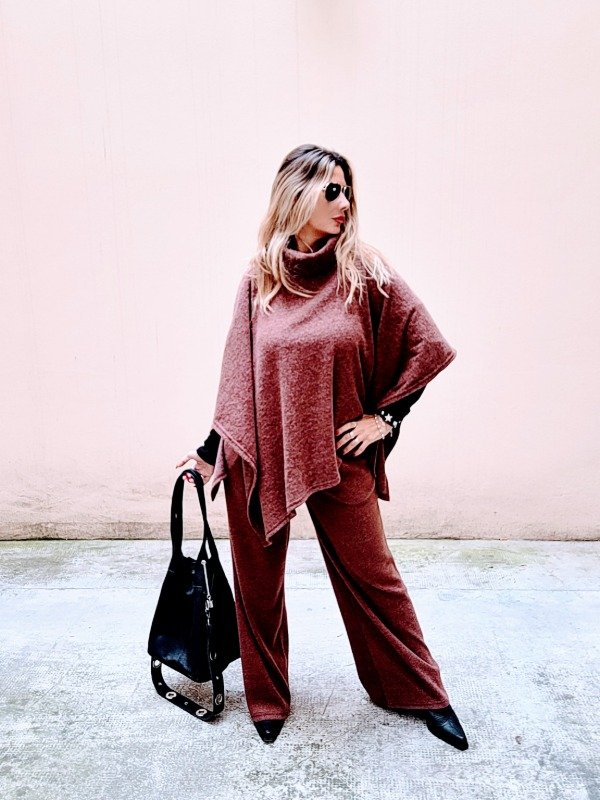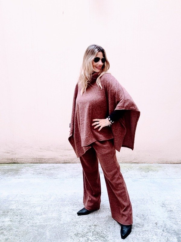 👉Descripción: Conjunto de dos piezas en lanilla brush tipo polar: poncho cuello polerón, corte rectangular y palazzo ancho recto.